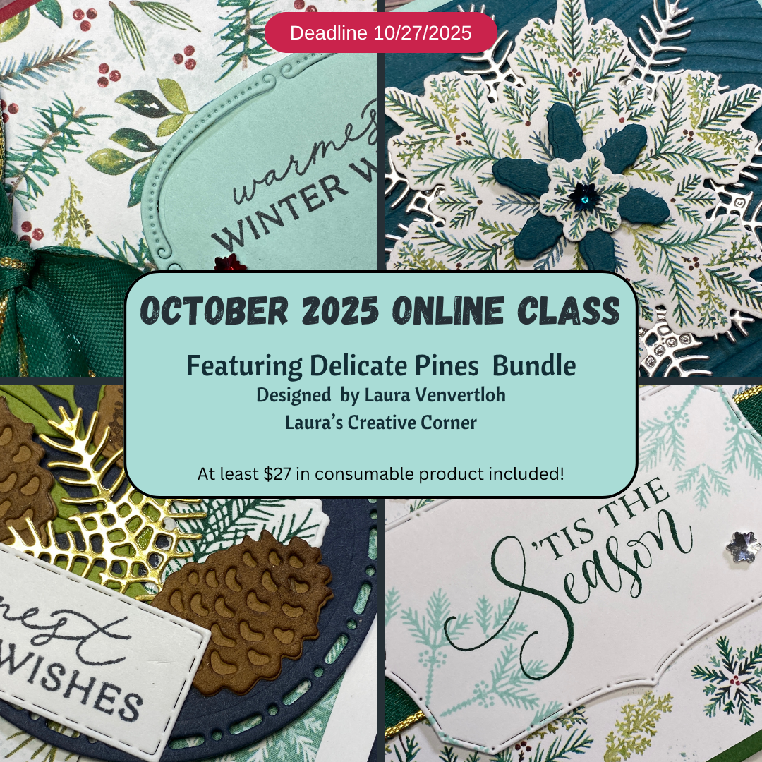 I’m so excited to share a brand-new online class featuring the beautiful Delicate Pines Bundle! Price includes shipping & up to $28 of consumable products! This is the perfect class to create at your own pace!