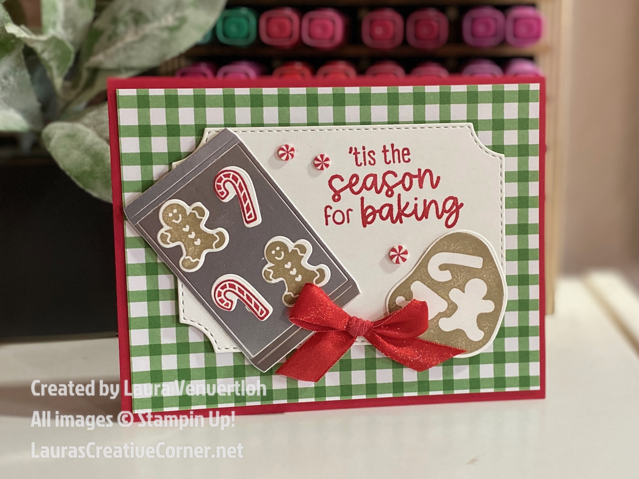 - Stamp the baking images (rolling pin, oven mitt, candy cane, etc.) in Crumb Cake for that warm, kitchen-baked look.