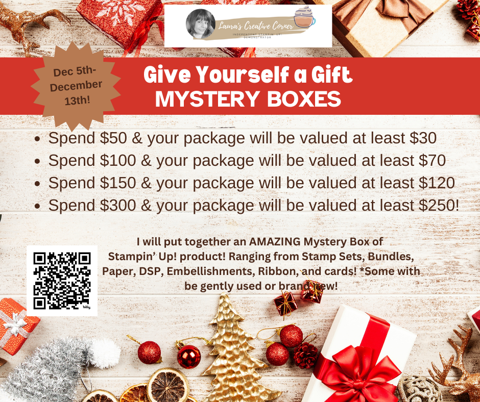 HUGE NEWS!! December 10th-12th you can get FREE Shipping with order over $75 (after rewards & before tax) Plus, you will have the option to purchase the Product of the Month for just $5!! It’s the True Blues 12×12 paper, and it’s GORGEOUS!! BUT, that is not all! I have my own promotion going! The more you order, you get a Mystery Box from ME!! (Yes, I pay the shipping on the Mystery Box) So much bang for your buck!!