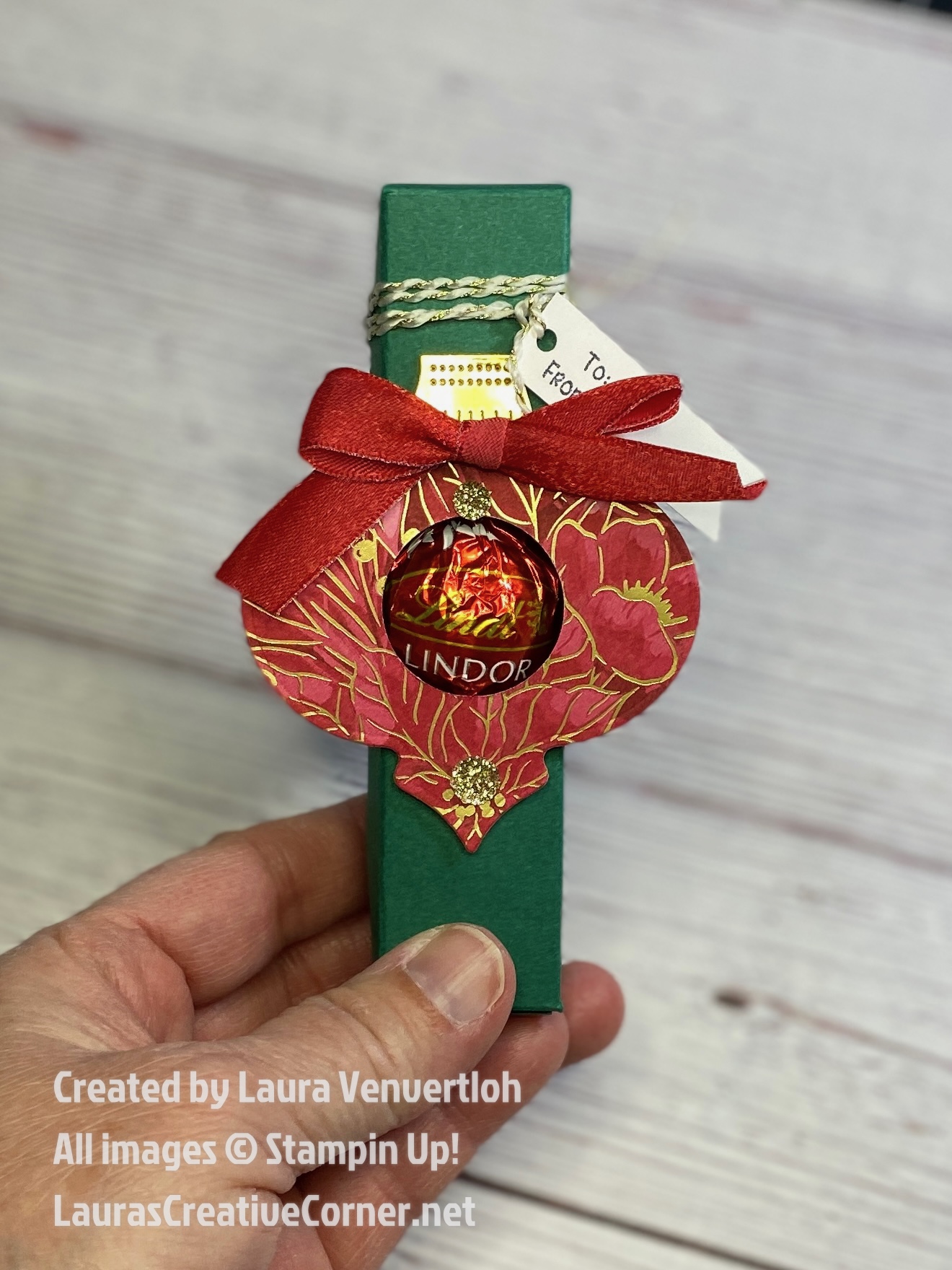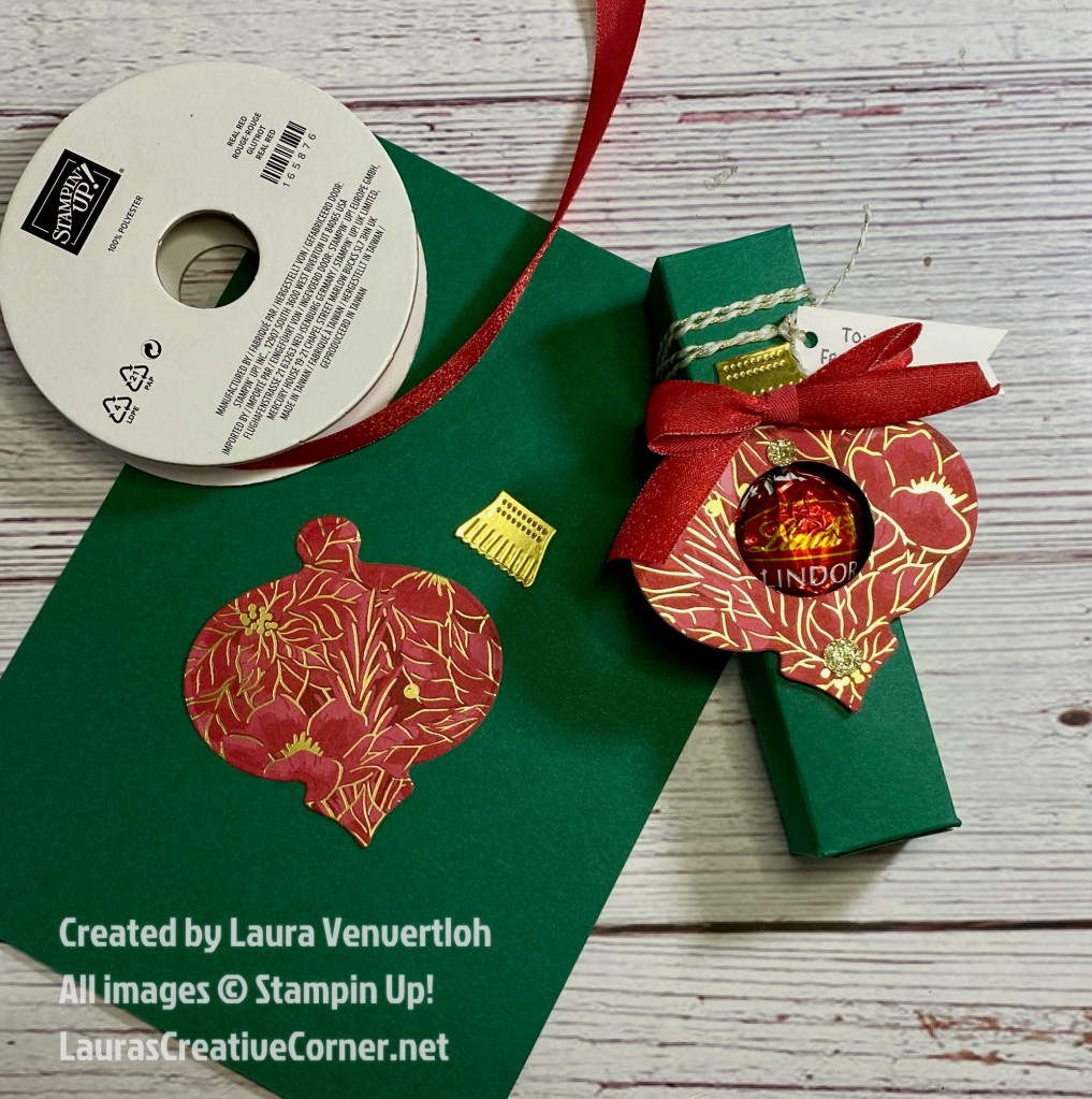 Sometimes the smallest gifts bring the biggest smiles. This sweet little treat box is the perfect way to dress up Lindt Chocolate Balls for the holidays. With just one piece of cardstock, a few score lines, and festive embellishments, you’ll have a beautiful handmade package that’s great for gifting, table favors, or adding to a holiday basket.
