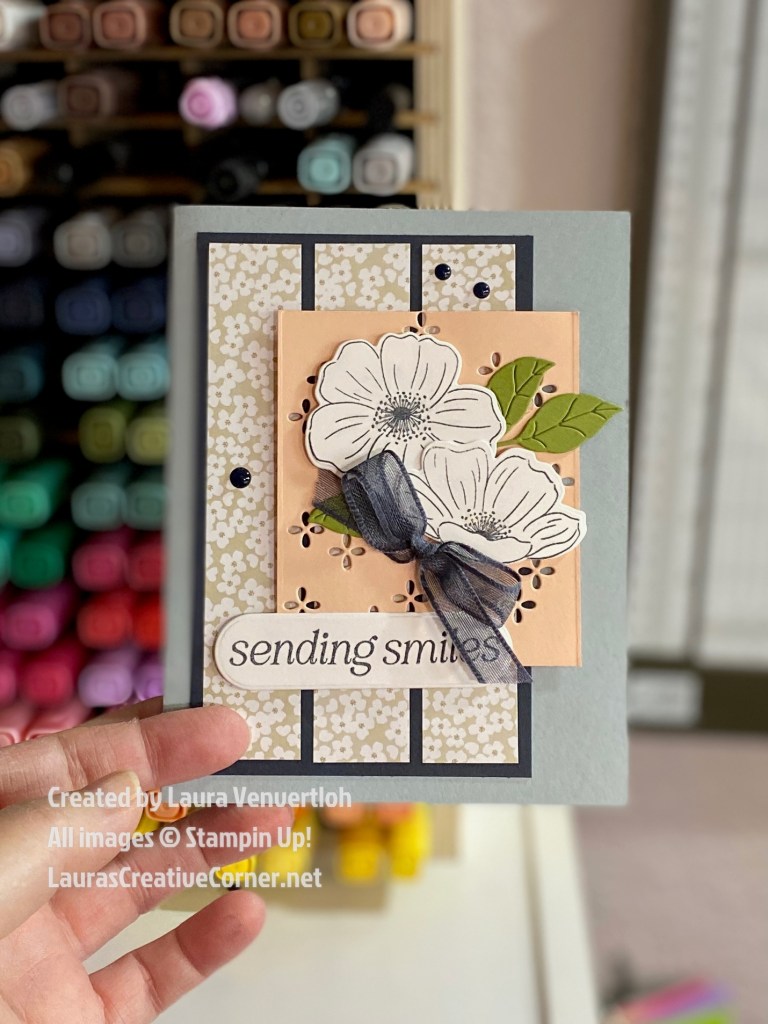 - Die-cut panel (solid die with small flower cutouts): 2 3/4″ x 3 1/4″ for added texture and visual interest