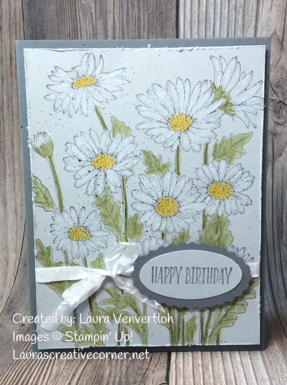 Don't you just love a stamp set that is all in one and can make such an impact on your finished project? I fell in love with the Daisy Garden background stamp when I saw the sneak peek of the Annual Catalog! And it coordinates well with our daisy punches and the Daisy Lane stamp… Continue reading Delicate Daisy Garden