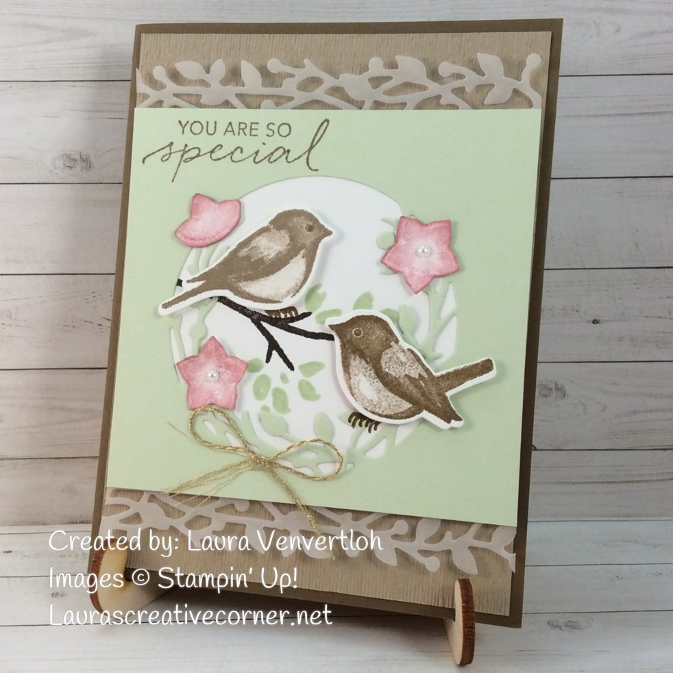 This card was what I call an "unintentional" card! I really was just playing with the Birds & More dies to see what they look like. I then did the next thing I do in the design process and choose colors. I saw a Crumb Cake piece that was already run through with the Subtle… Continue reading Birds & Branches Beauty