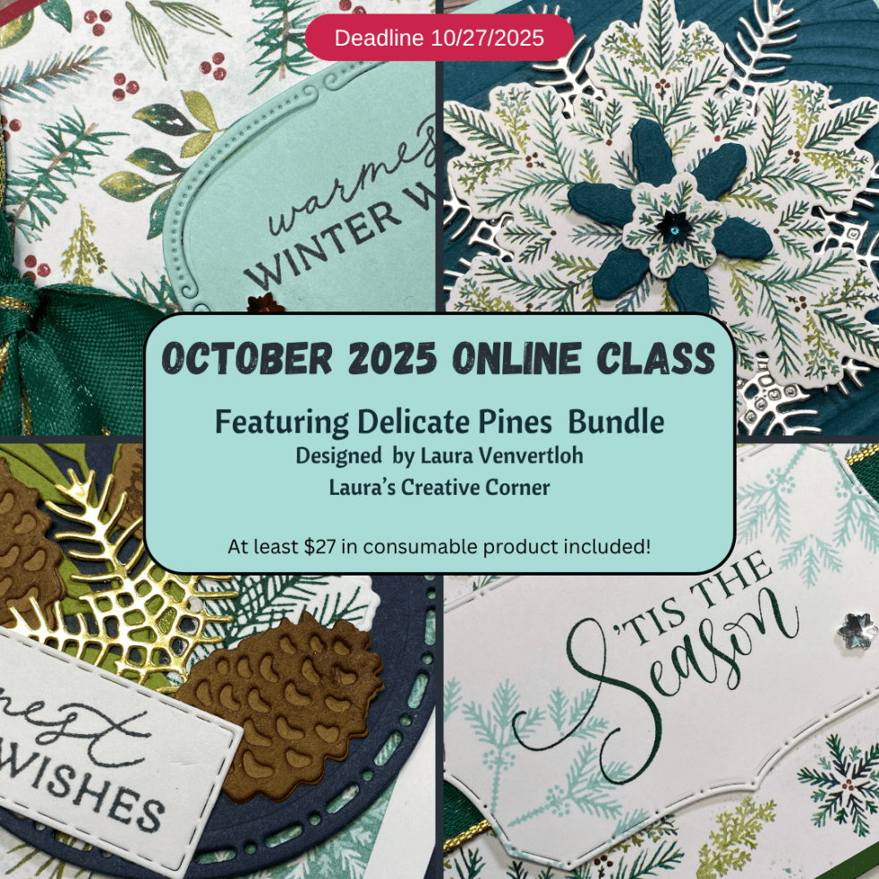 Iโm so excited to share a brand-new online class featuring the beautiful Delicate Pines Bundle! Price includes shipping & up to $28 of consumable products! This is the perfect class to create at your own pace! What Youโll Receive with Your $44 Registration: ยฝ pack of Elegant Pines DSP (12x6) A spool of Shaded Spruce… Continue reading Just Released! New Online Class!