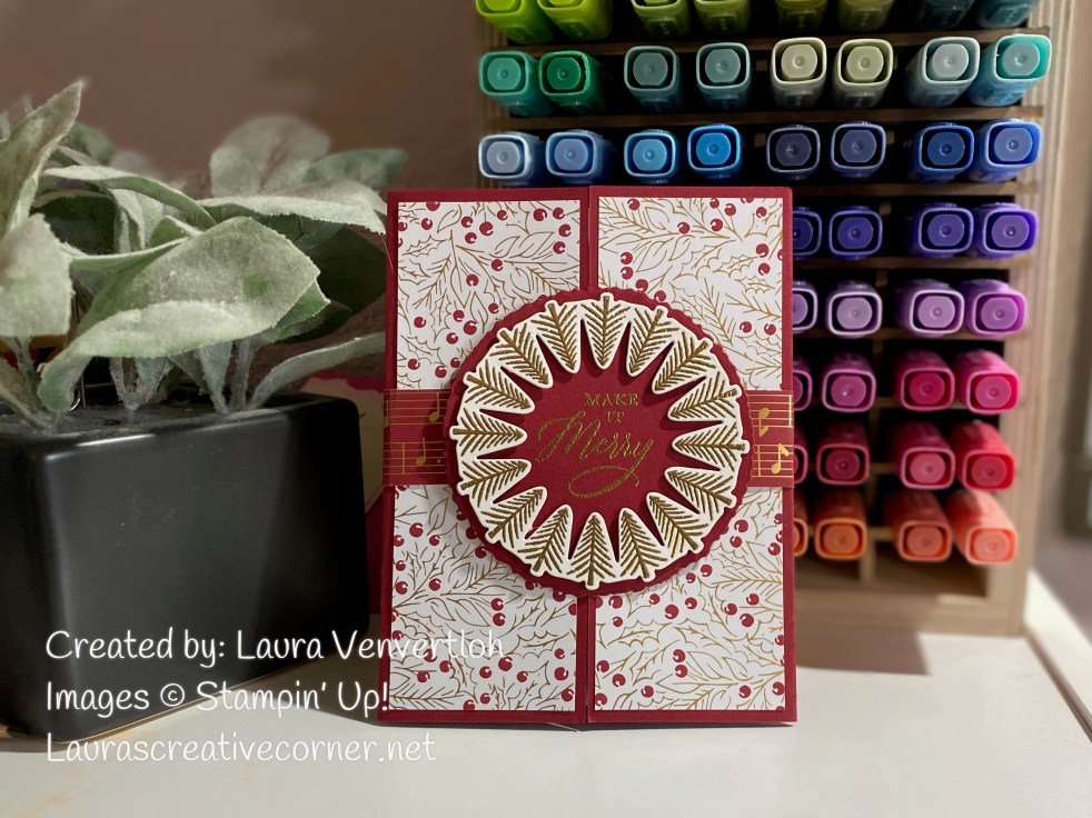The Wishes All Around bundle is so unique with its circular images and coordinating dies! My dear friend showed me a card that had all white and gold embossing powder on it-and inspiration struck! I tried the melted Gold Embossing Powder on Mossy Meadow and Cherry Cobbler using the same stamp. Once I pulled out… Continue reading Wishes All Around Fun Fold